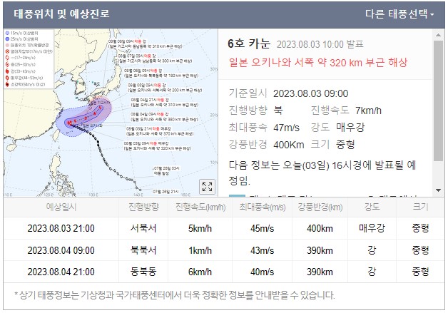 태풍 카눈은 현재 일본 오키나와 서쪽 약 320km 부근 해상에 위치하고 있습니다. 다행히 우리나라를 비껴간 듯 합니다. 매우 강한 중형크기의 태풍이라 우리나라로 향했다면 굉장히 큰 피해를 입혔을 것으로 예상됩니다. 하지만 실시간으로 이동하는 태풍이기 때문에 아래에서 실시간 태풍 카눈 경로와 위치를 확인해 보시길 바랍니다.